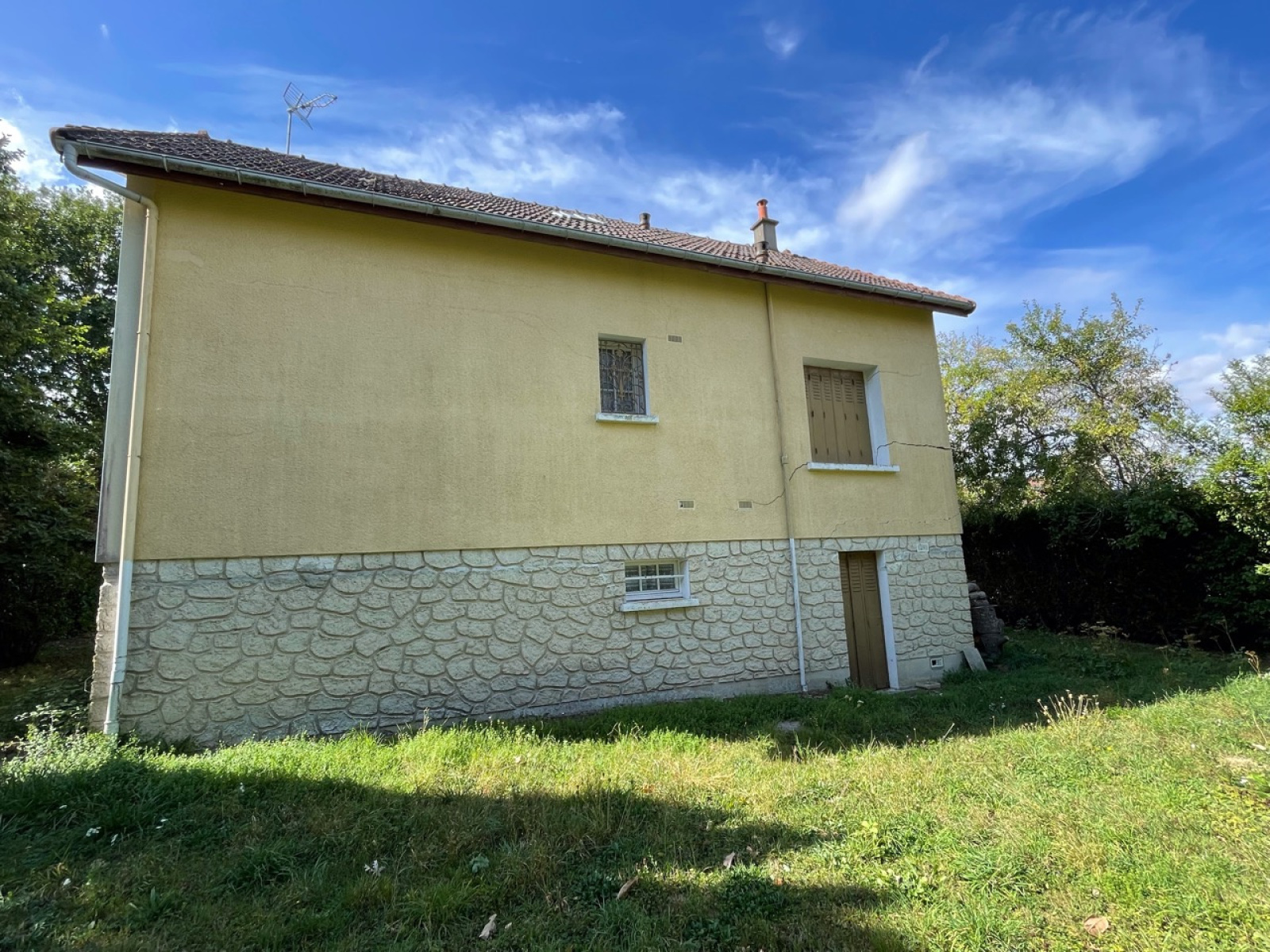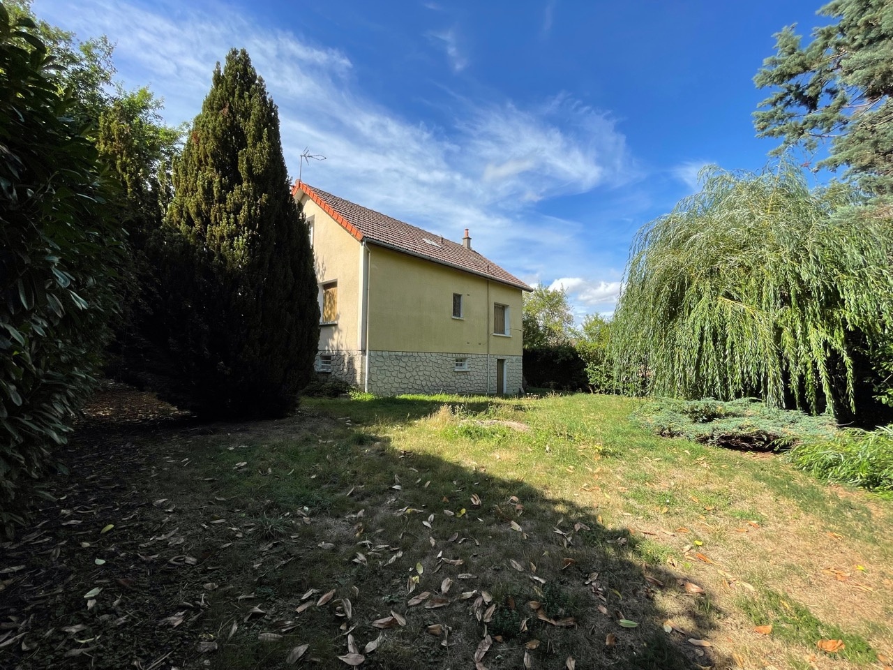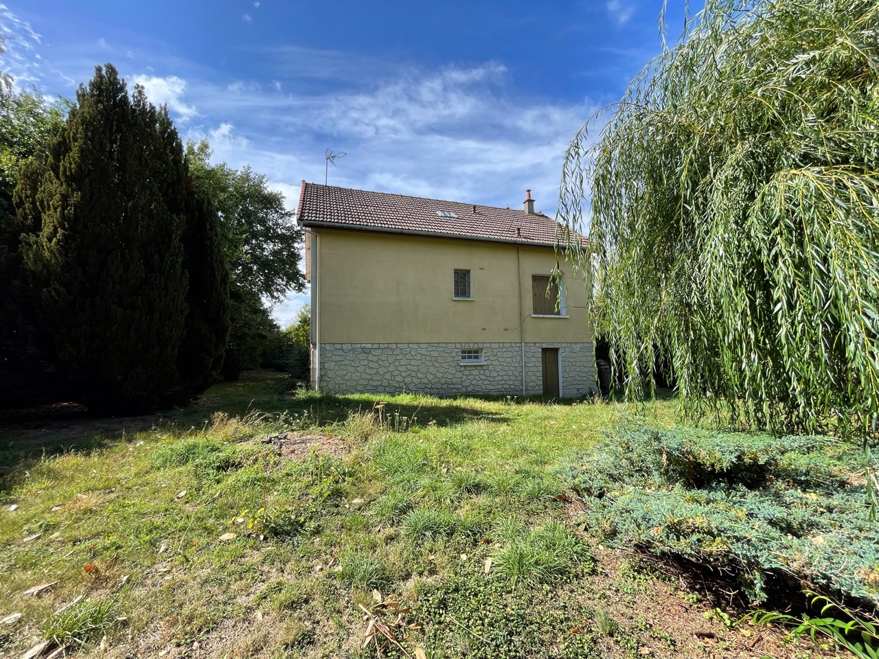 Maison à usage d'habitation de type Pavillon sur sous-sol total à réhabiliter (reprise en sous-?uvre obligatoire, affaissement des fondations) comprenant entrée sur couloir, salon séjour, cuisine, deux chambres, salle de bains, toilettes, à l'étage couloir desservant deux chambres, cabinet de toilette, deux petits greniers, terrain clos de grillage et terrain attenant réputé à bâtir, le tout sur une parcelle de 1 833 m² environ. Prestations : Chauffage central fioul, exposition EST/OUEST.