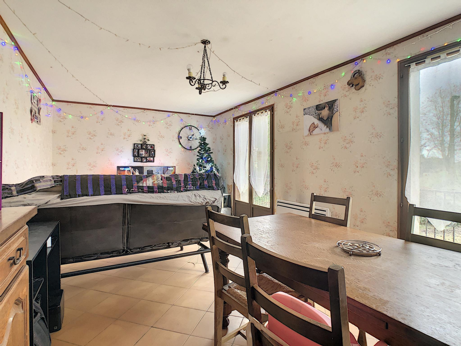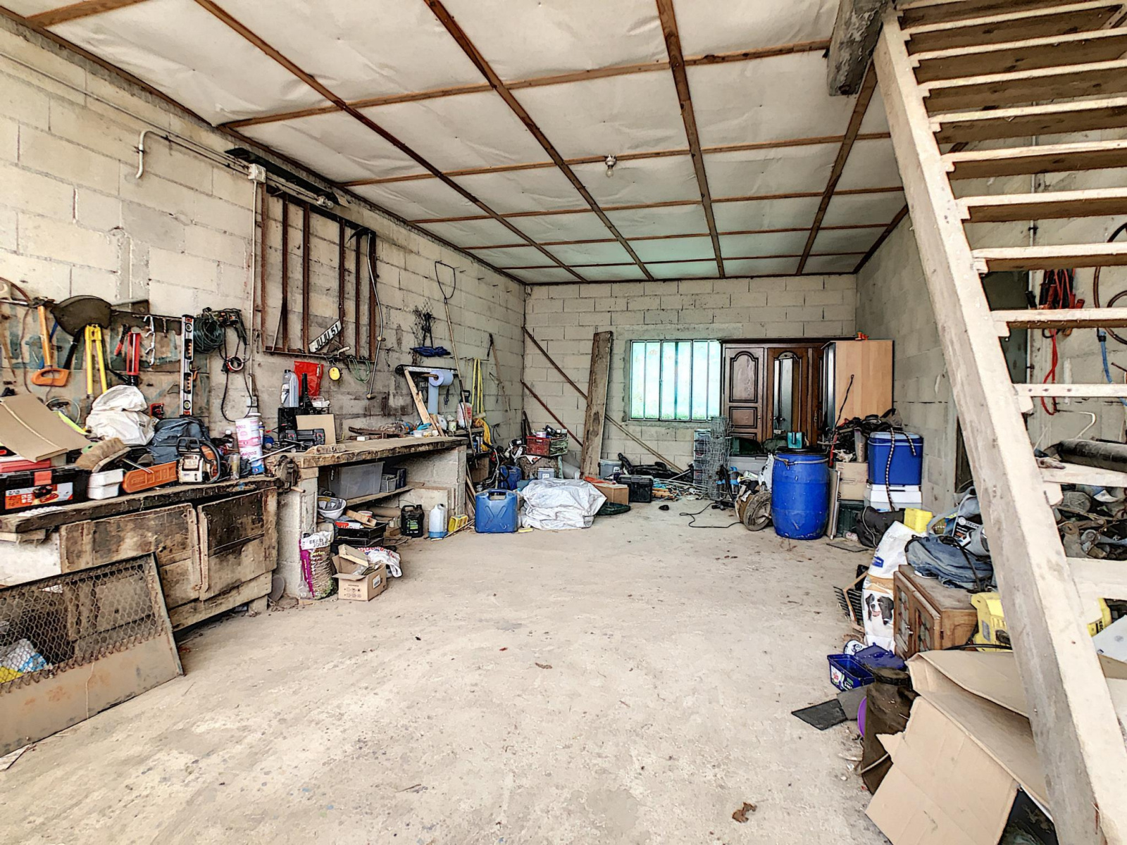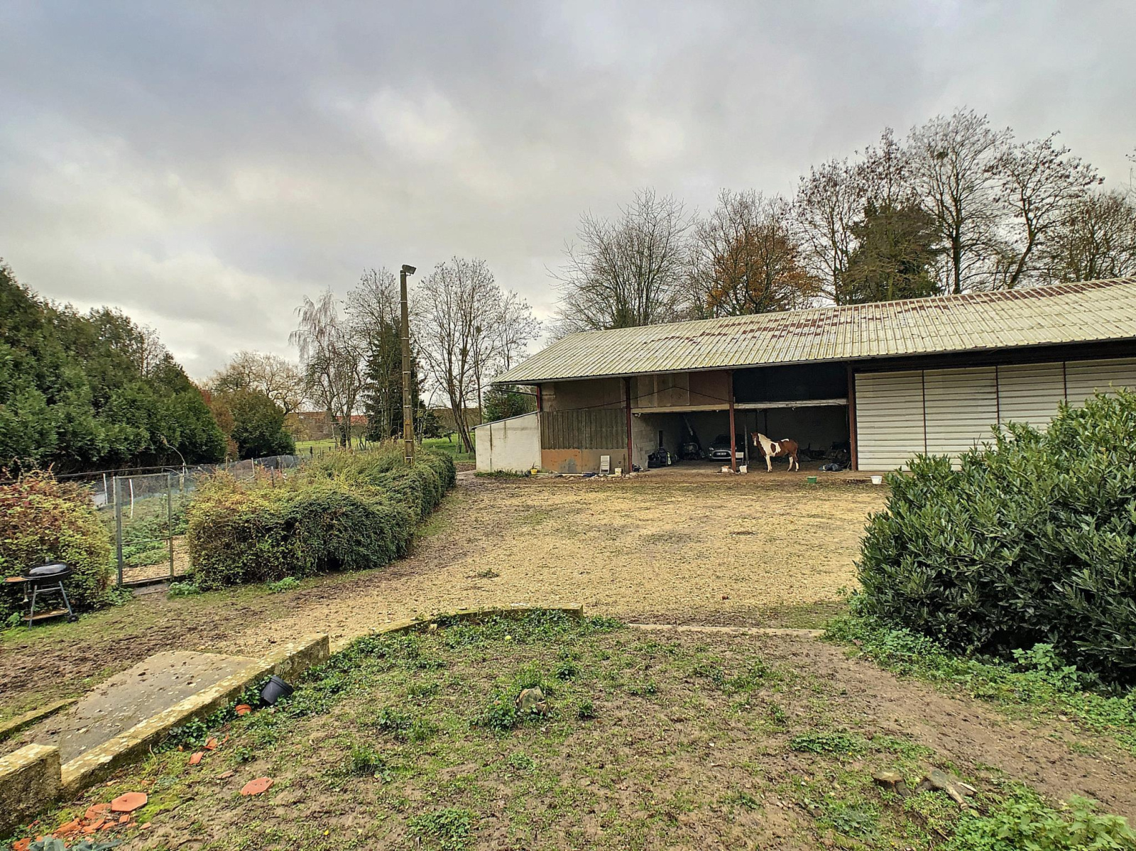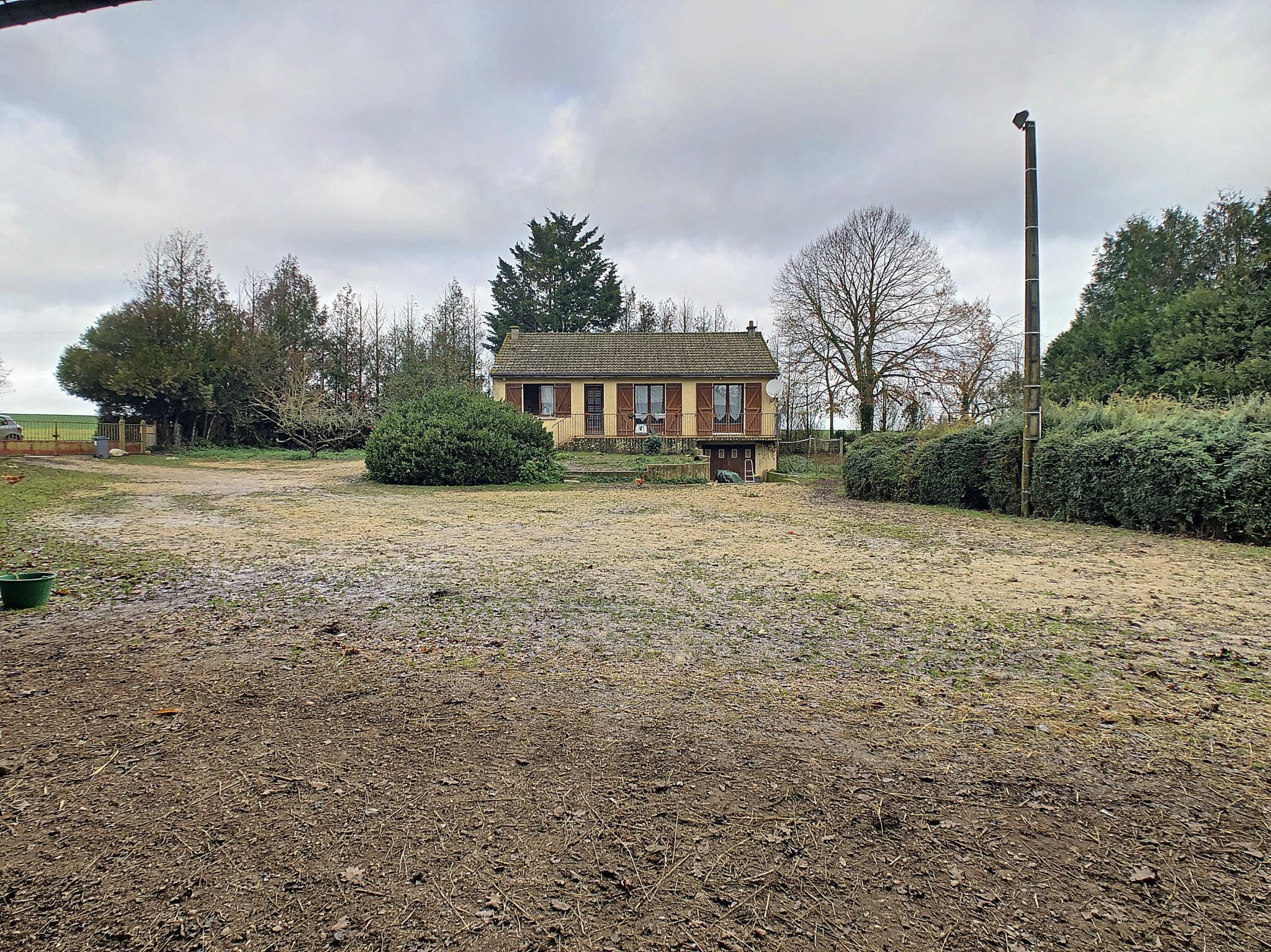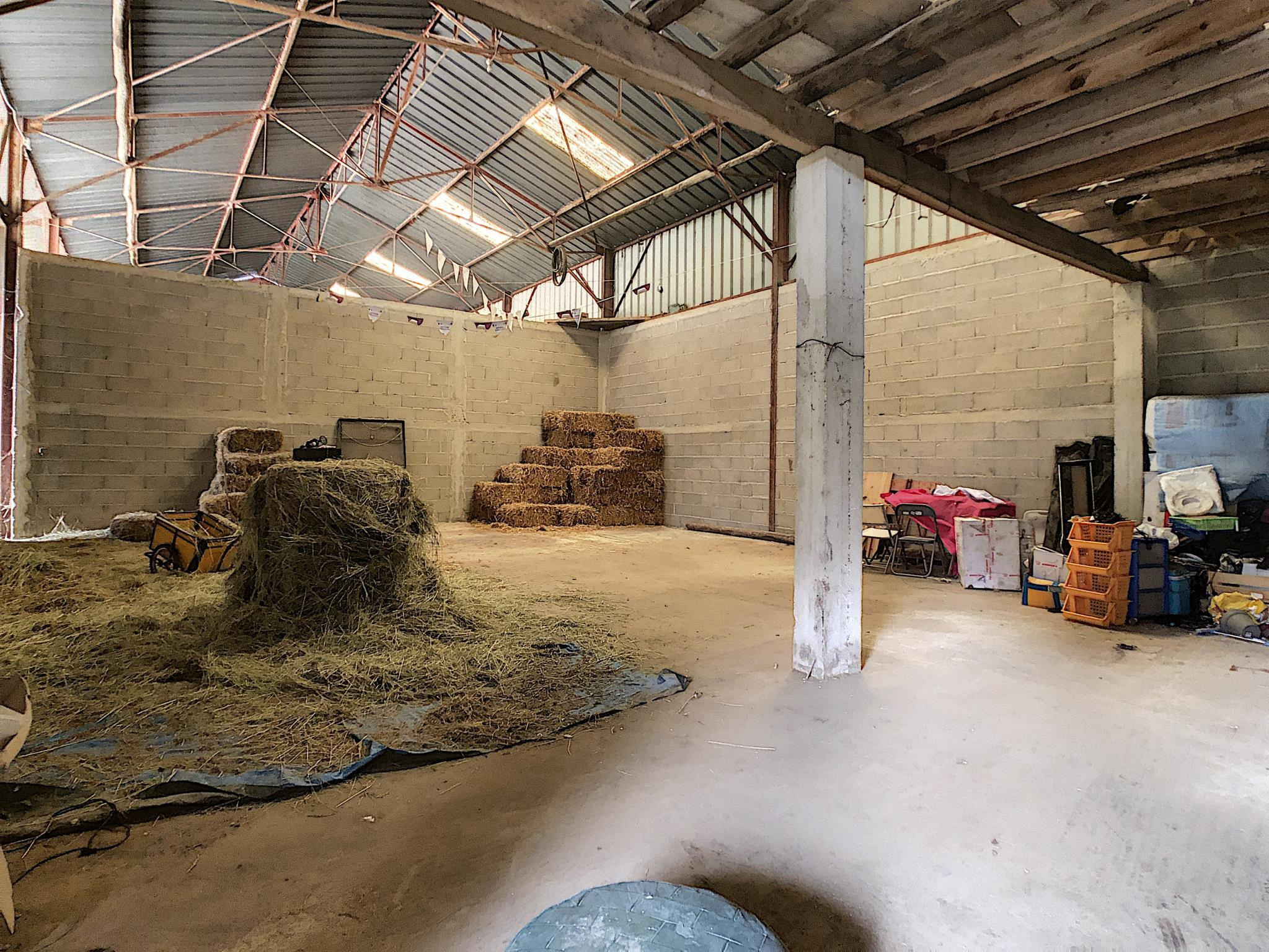 Pavillon de plain-pied sur sous-sol total comprenant entrée sur couloir, salon séjour, cuisine, salle d'eau, toilettes, trois chambres. En annexe: dépendance tôlée compartimentée (dépendance 142 m², hangar, atelier, garage, trois box à chevaux de 12 m²), terrain partiellement clos, mare, le tout sur une parcelle de 14 704 m². Prestations: pavillon traditionnel, habitable, double vitrage ancien, chauffage électrique, exposition SUD
