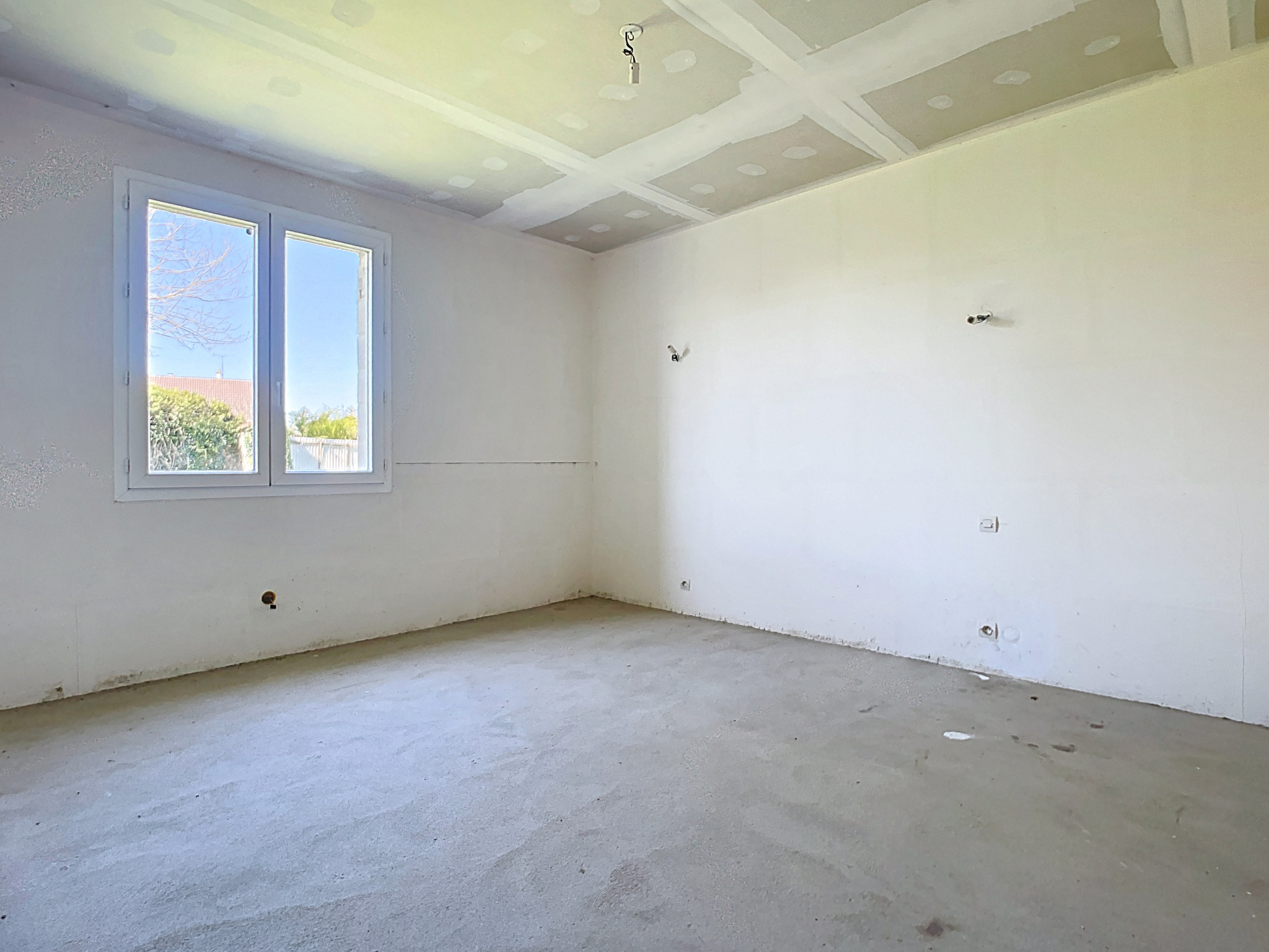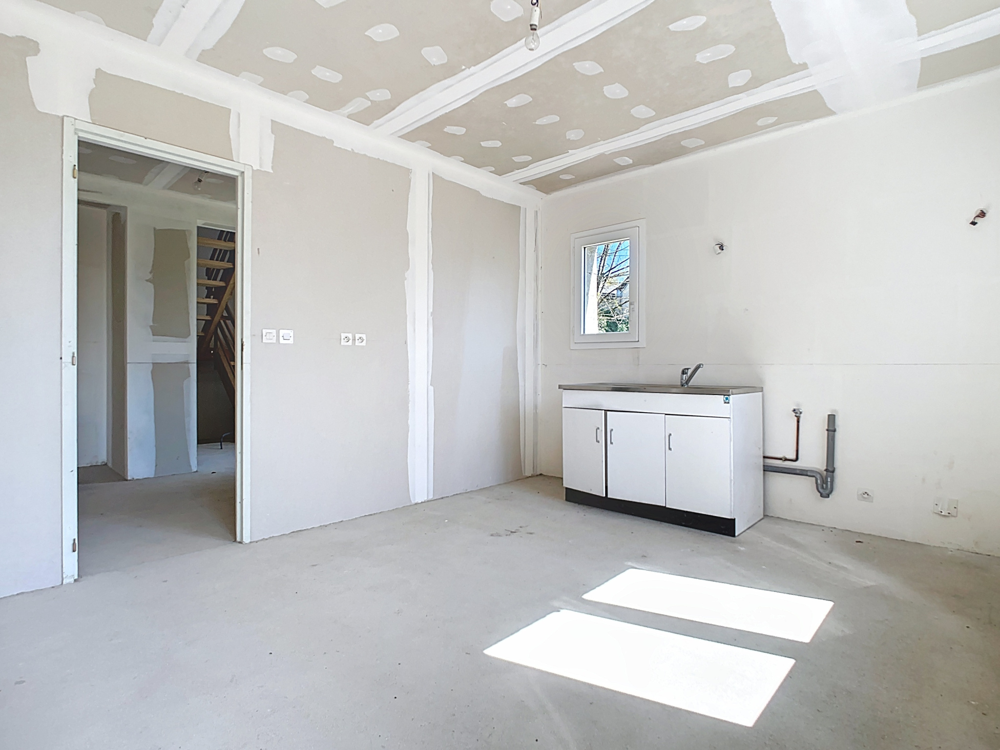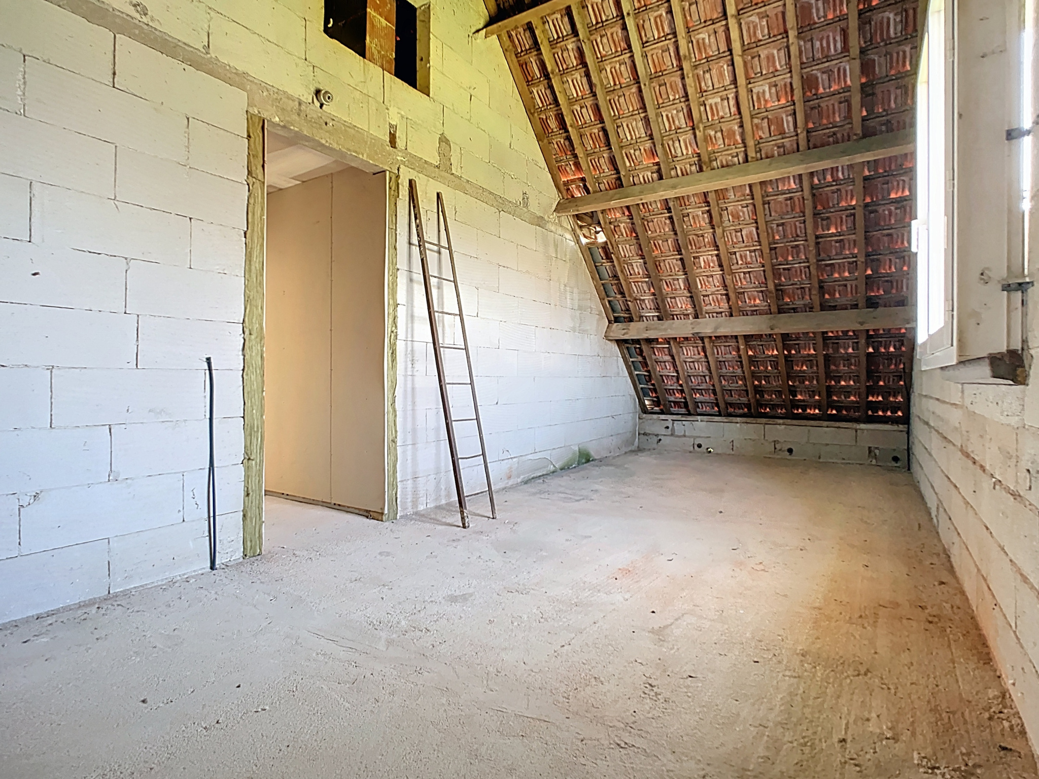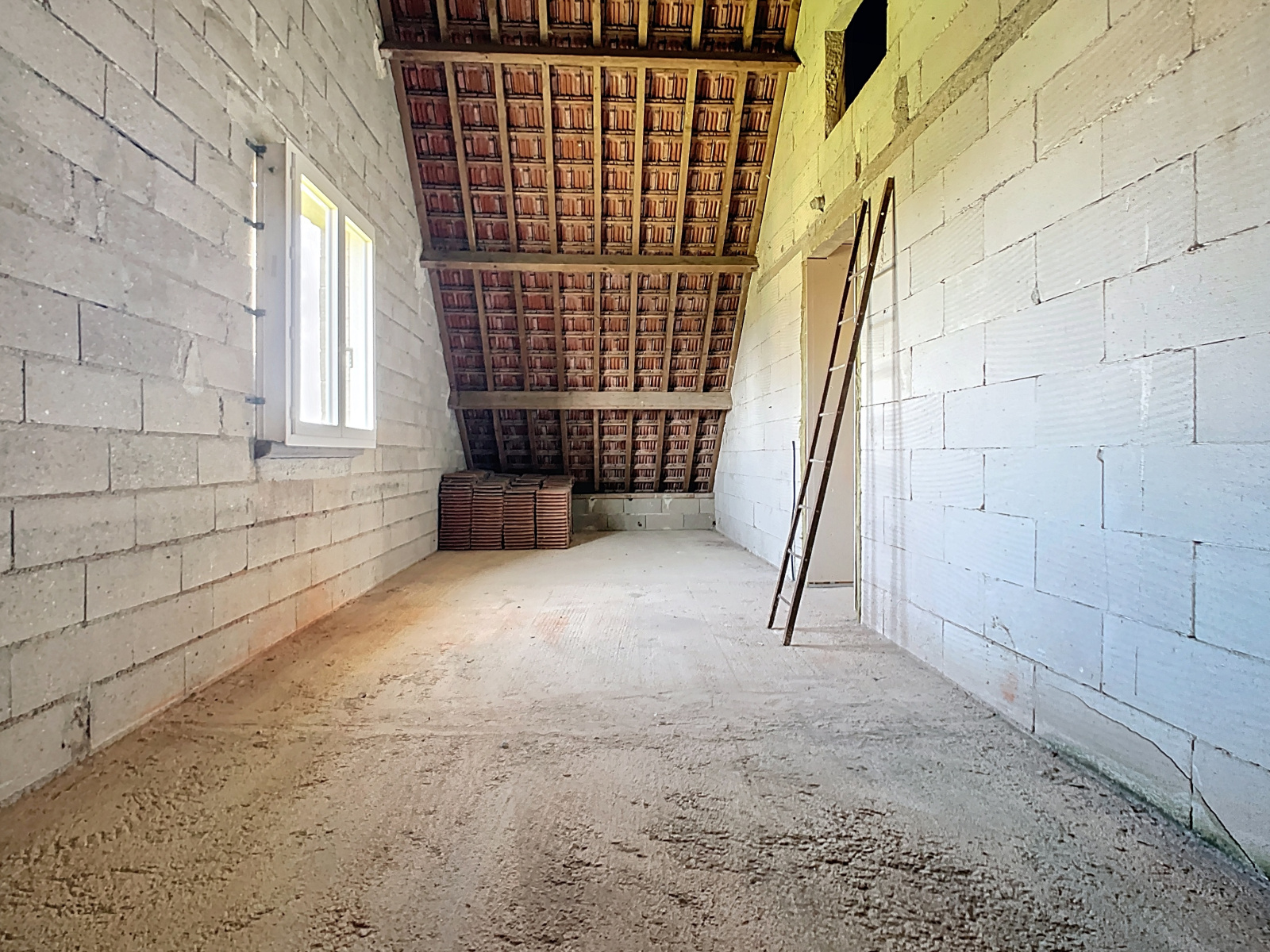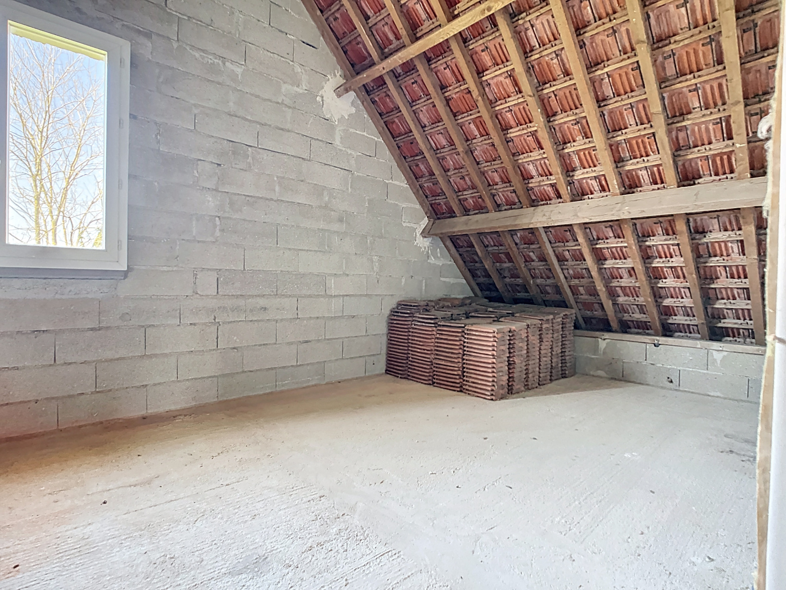 Maison de ville de type pavillon traditionnel à finir et sans éléments d'équipements comprenant : hall d'entrée, cuisine, salon-séjour avec conduit de cheminée, chambre, salle de bains, toilettes, buanderie, à l'étage: palier et couloir desservant deux chambres, salle de jeux, bureau, salle d'eau, toilettes, comble perdus au-dessus, le tout élevé sur sous-sol-cave compartimenté en trois pièces, plus vide-sanitaire. Terrain divisible et en zone constructible et sans aucuns vis-à-vis, assainissement tout à l'égout, double vitrage PVC avec volets PVC à la française, murs isolés par 100 mm de laine de verre, toiture isolée par 200 mm de laine de verre, et 300 mm de floconnage au plafond de l'étage, exposition sud/ouest.