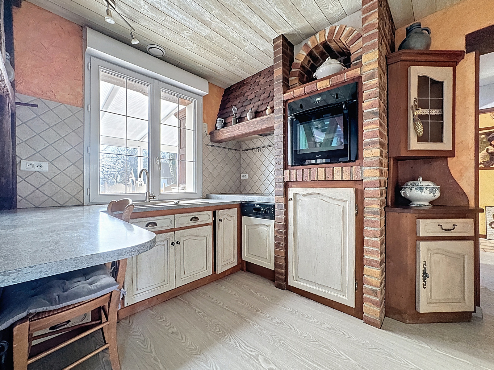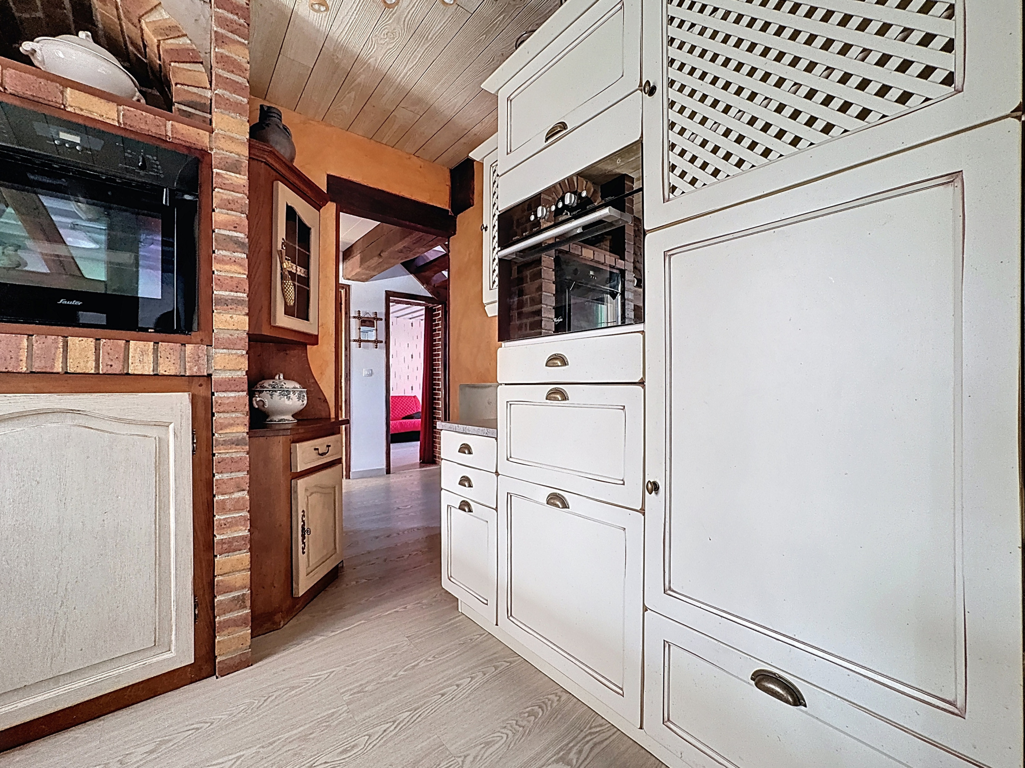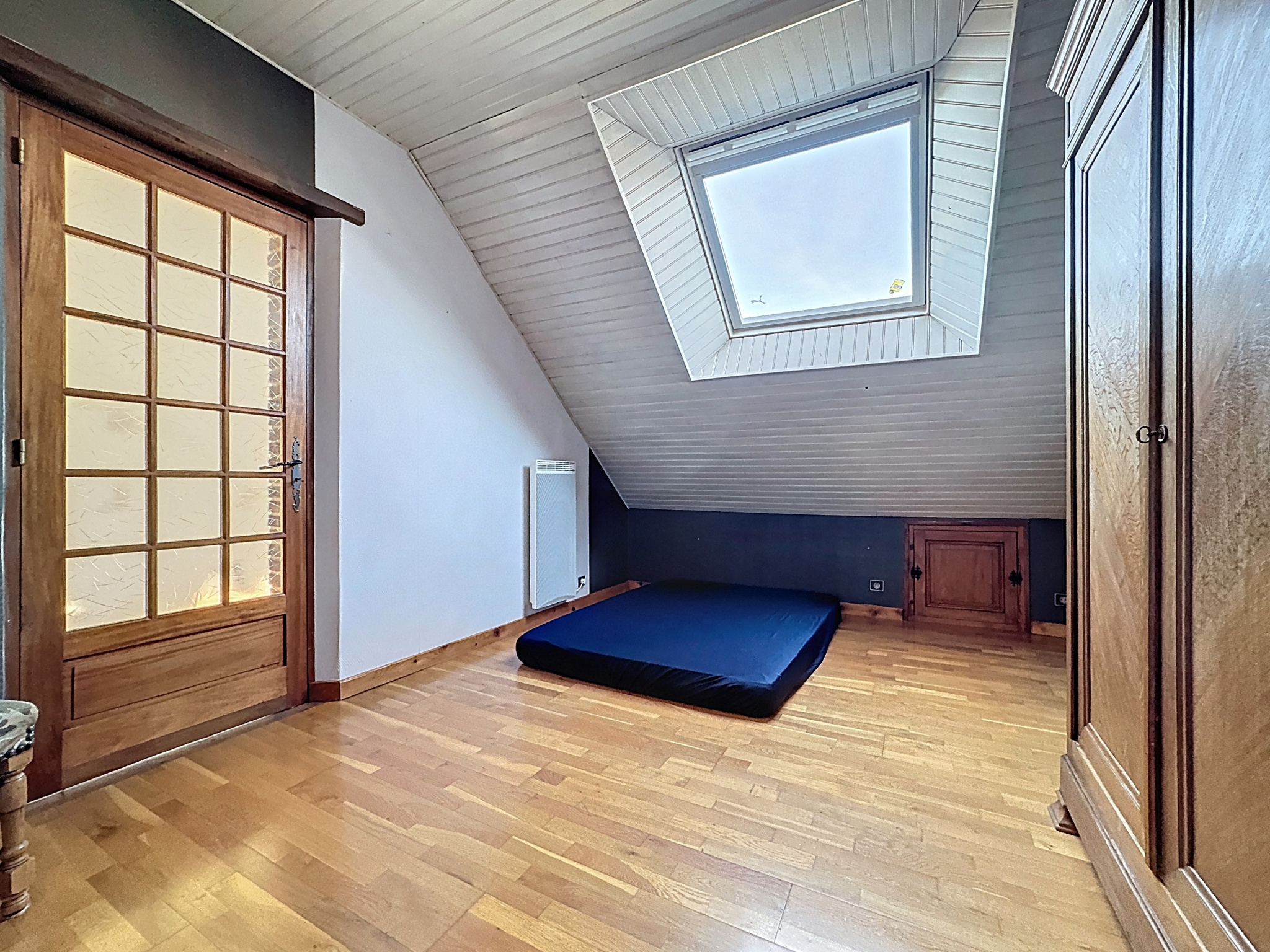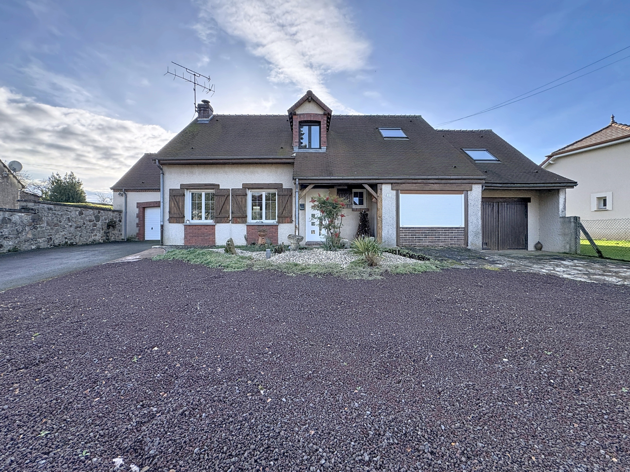 Prestations : pavillon traditionnel en parpaings, isolation des murs par polyuréthane 60 mm, de la toiture par 240 mm laine de verre, double vitrage PVC oscillo-battants et volets roulants électriques, porte de garage électrique, adoucisseur, vmc simple flux, poêle à bois pierres ollaire et radiateurs électrique (à inertie sèche et radiant) chauffage électrique au sol pour la véranda, assainissement individuel, double exposition nord/sud.