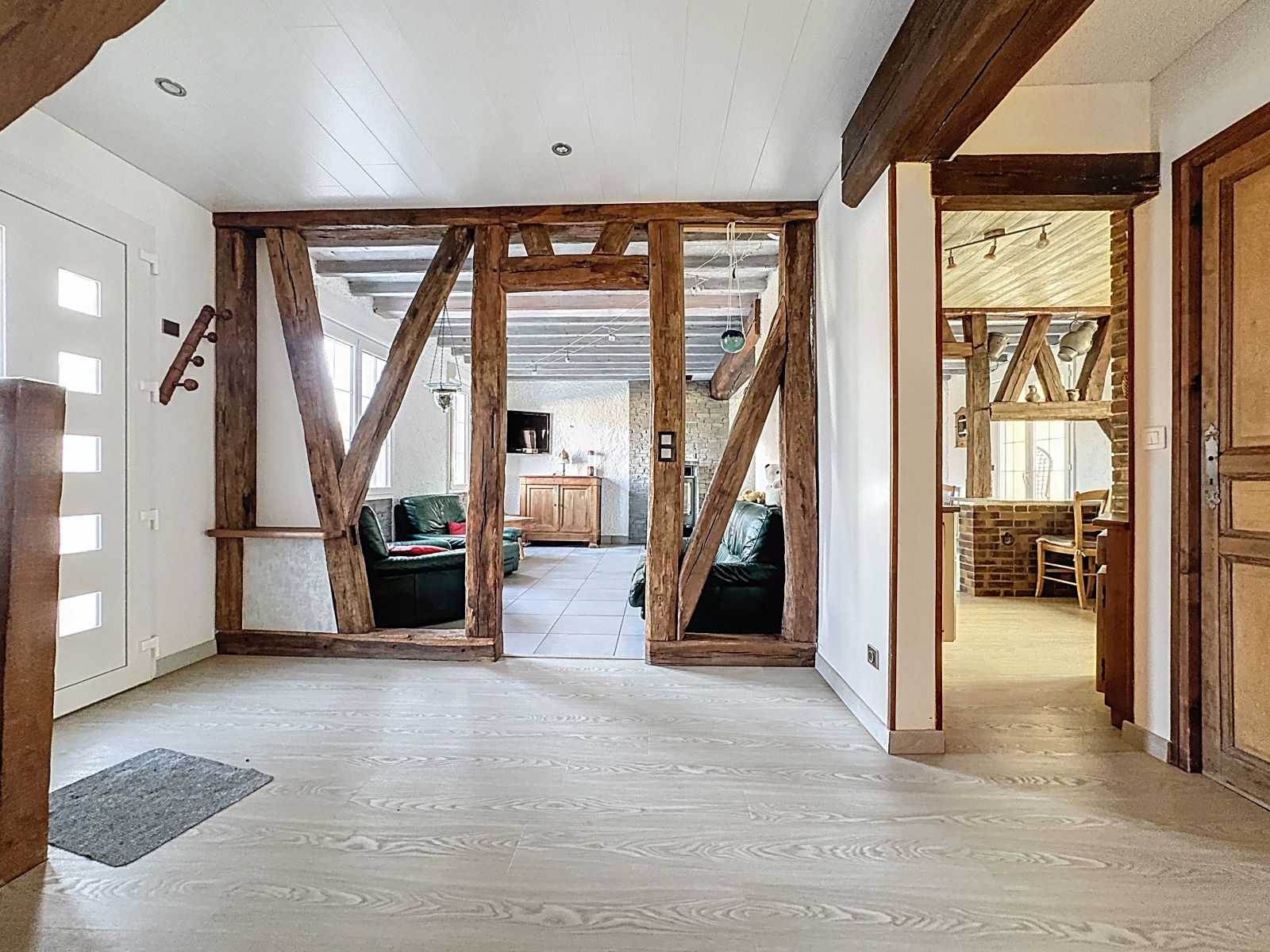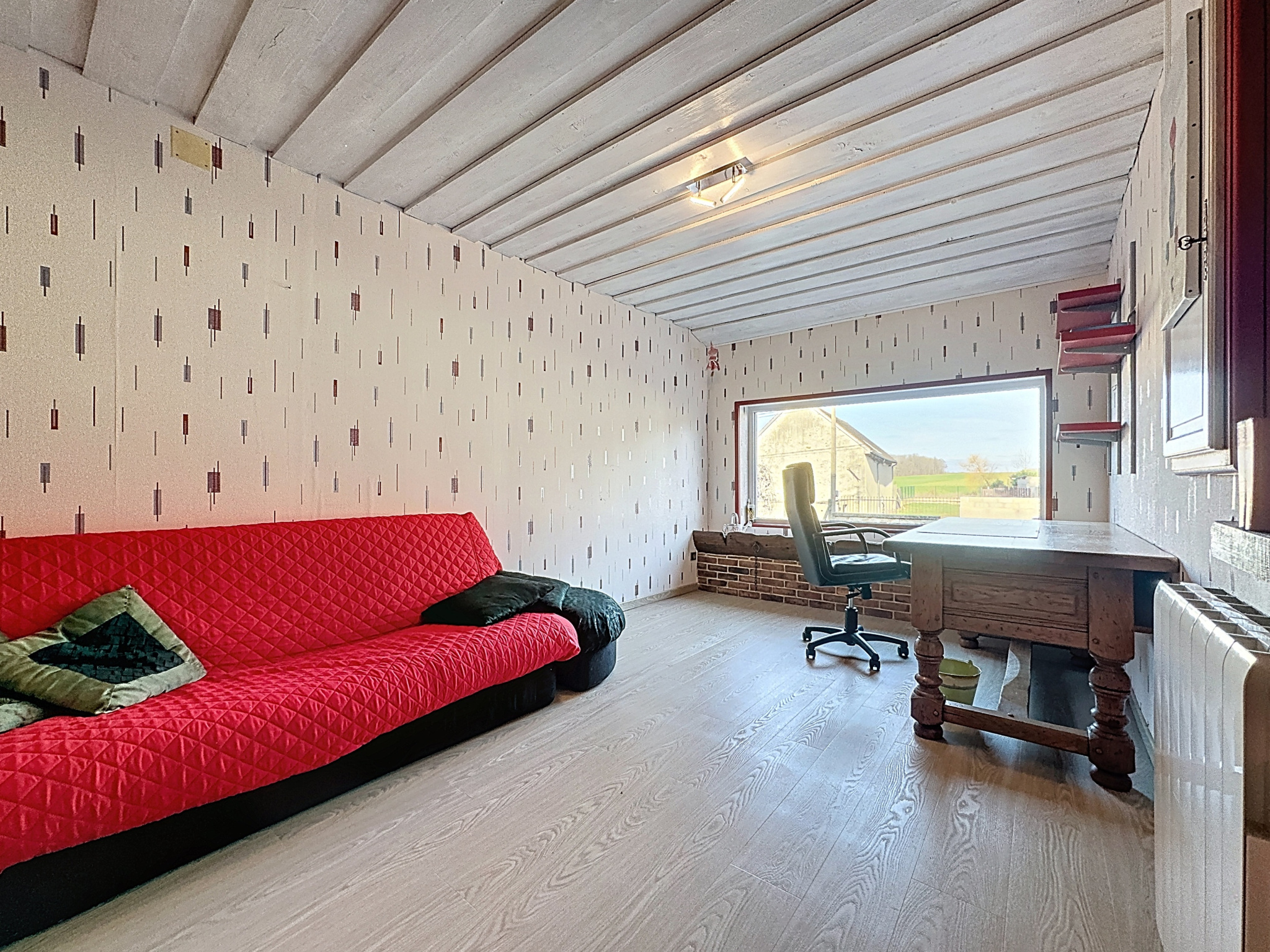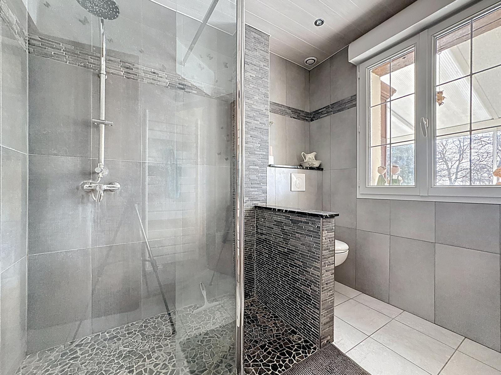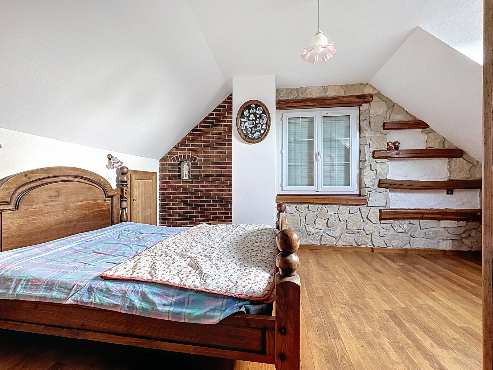 Prestations : pavillon traditionnel en parpaings, isolation des murs par polyuréthane 60 mm, de la toiture par 240 mm laine de verre, double vitrage PVC oscillo-battants et volets roulants électriques, porte de garage électrique, adoucisseur, vmc simple flux, poêle à bois pierres ollaire et radiateurs électrique (à inertie sèche et radiant) chauffage électrique au sol pour la véranda, assainissement individuel, double exposition nord/sud.