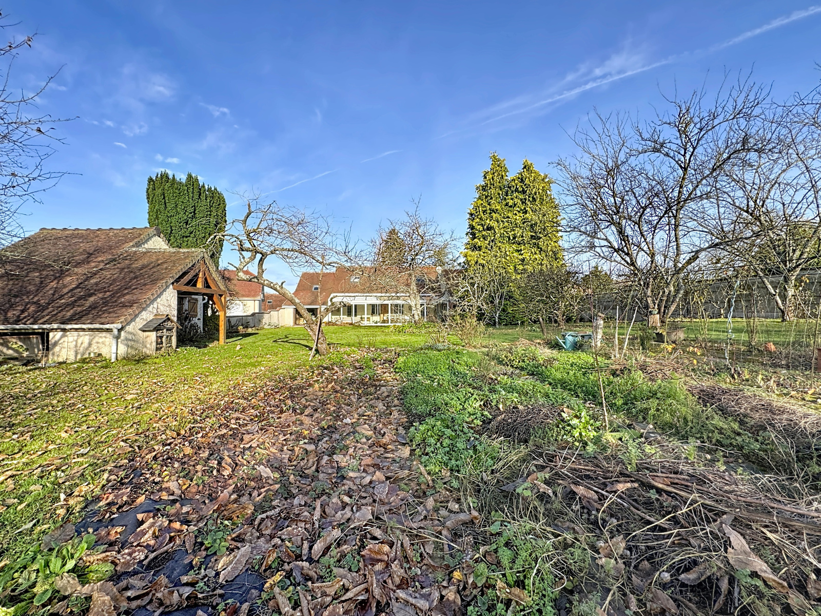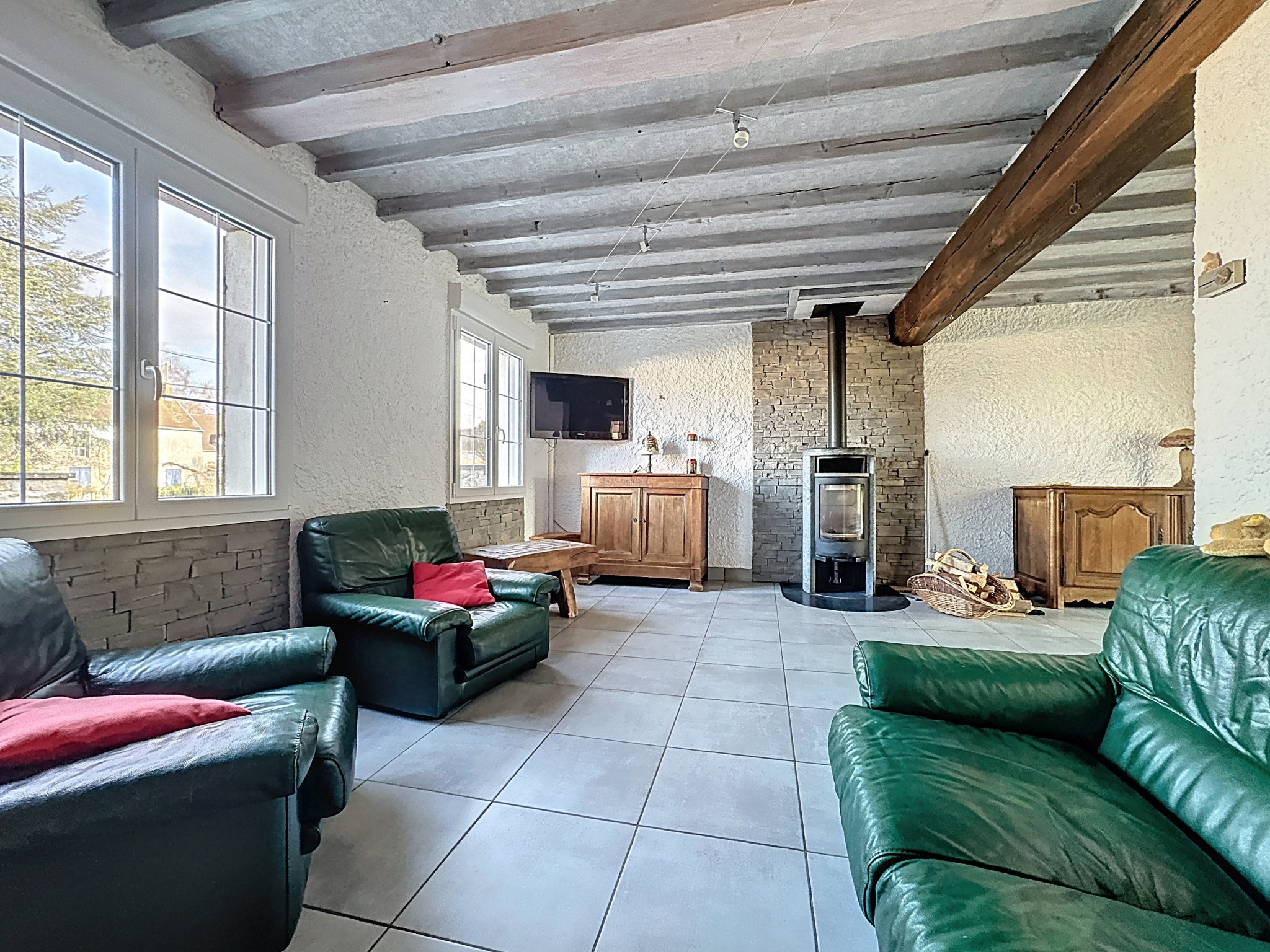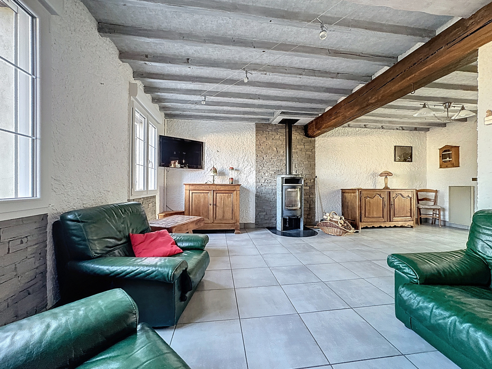 Maison d'habitation comprenant hall d'entrée, salon séjour en L avec poêle à bois, cuisine équipée ouverte sur séjour, bureau ou chambre, salle d'eau avec toilettes, buanderie, véranda chauffée, à l'étage : palier desservant deux chambres, une pièce à usage de chambre, salle de jeux, salle de bains avec toilettes, en annexe : deux garages (un avec cave et accès au vide-sanitaire, l'autre avec grenier), une dépendance, bassin, terrain arboré.