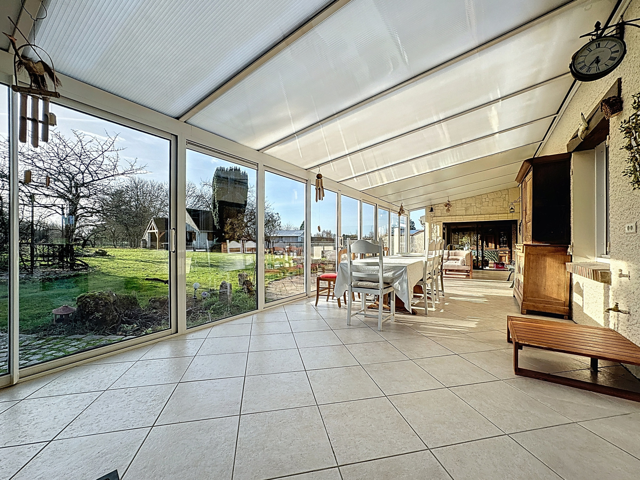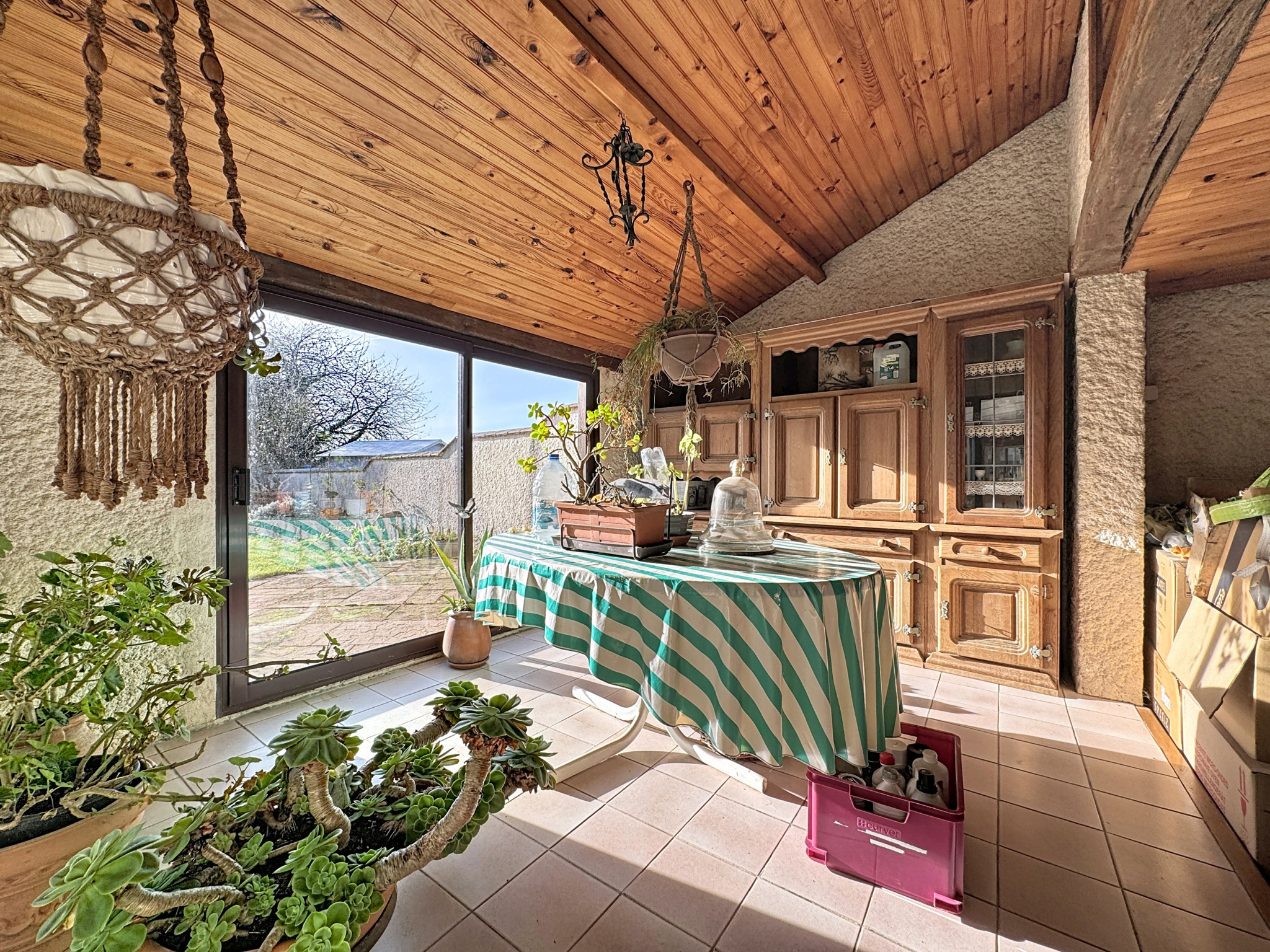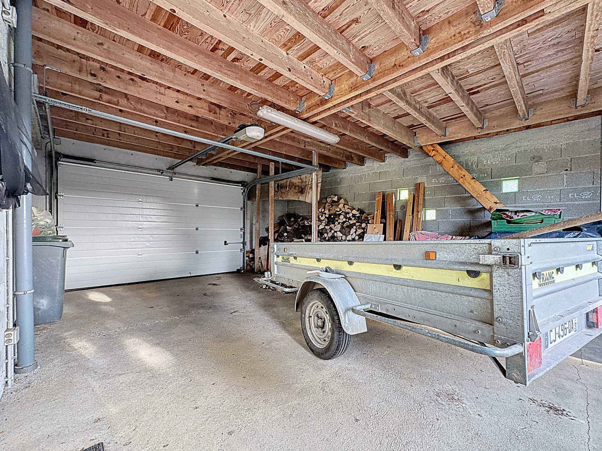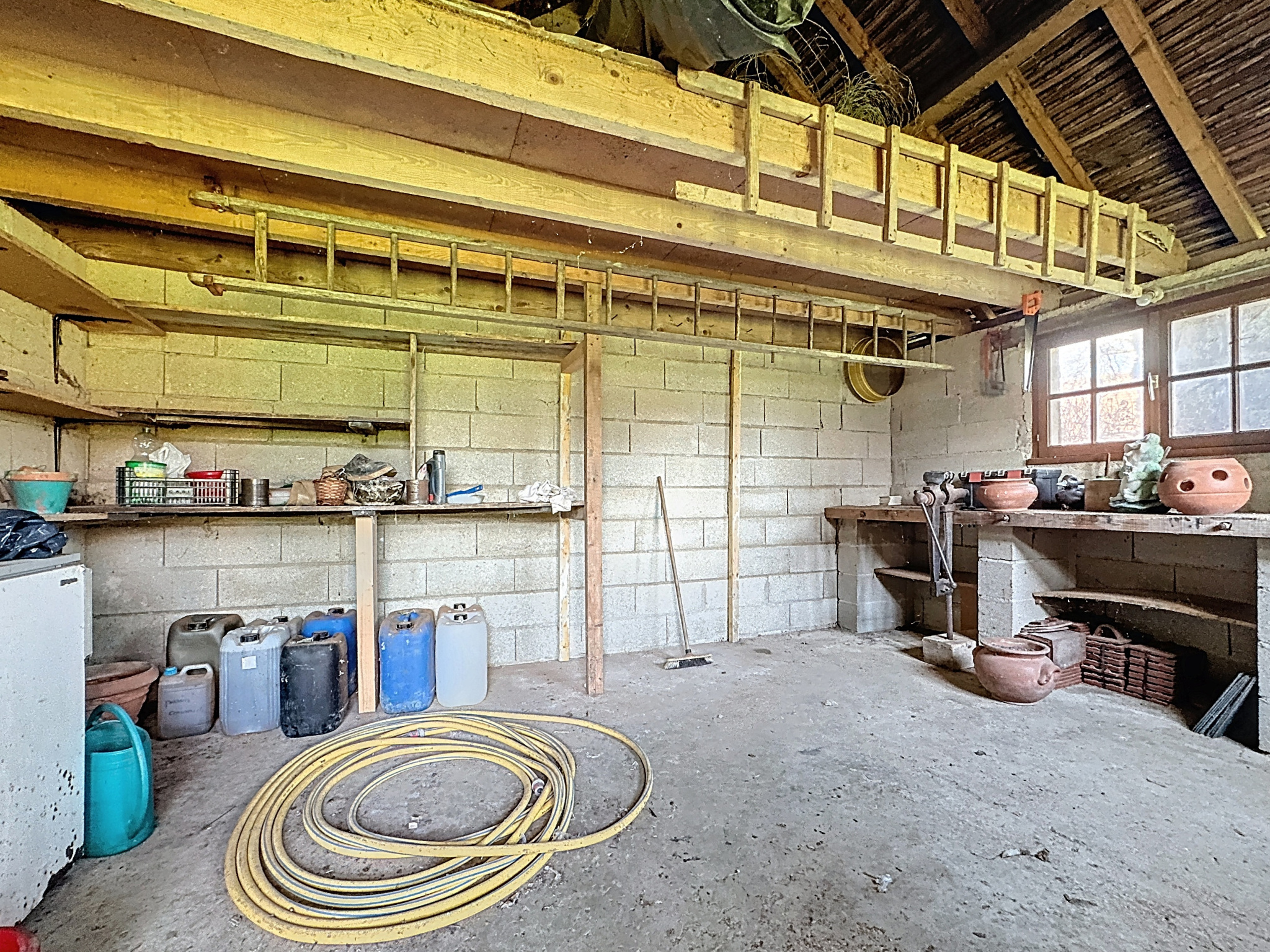 Maison d'habitation comprenant hall d'entrée, salon séjour en L avec poêle à bois, cuisine équipée ouverte sur séjour, bureau ou chambre, salle d'eau avec toilettes, buanderie, véranda chauffée, à l'étage : palier desservant deux chambres, une pièce à usage de chambre, salle de jeux, salle de bains avec toilettes, en annexe : deux garages (un avec cave et accès au vide-sanitaire, l'autre avec grenier), une dépendance, bassin, terrain arboré.