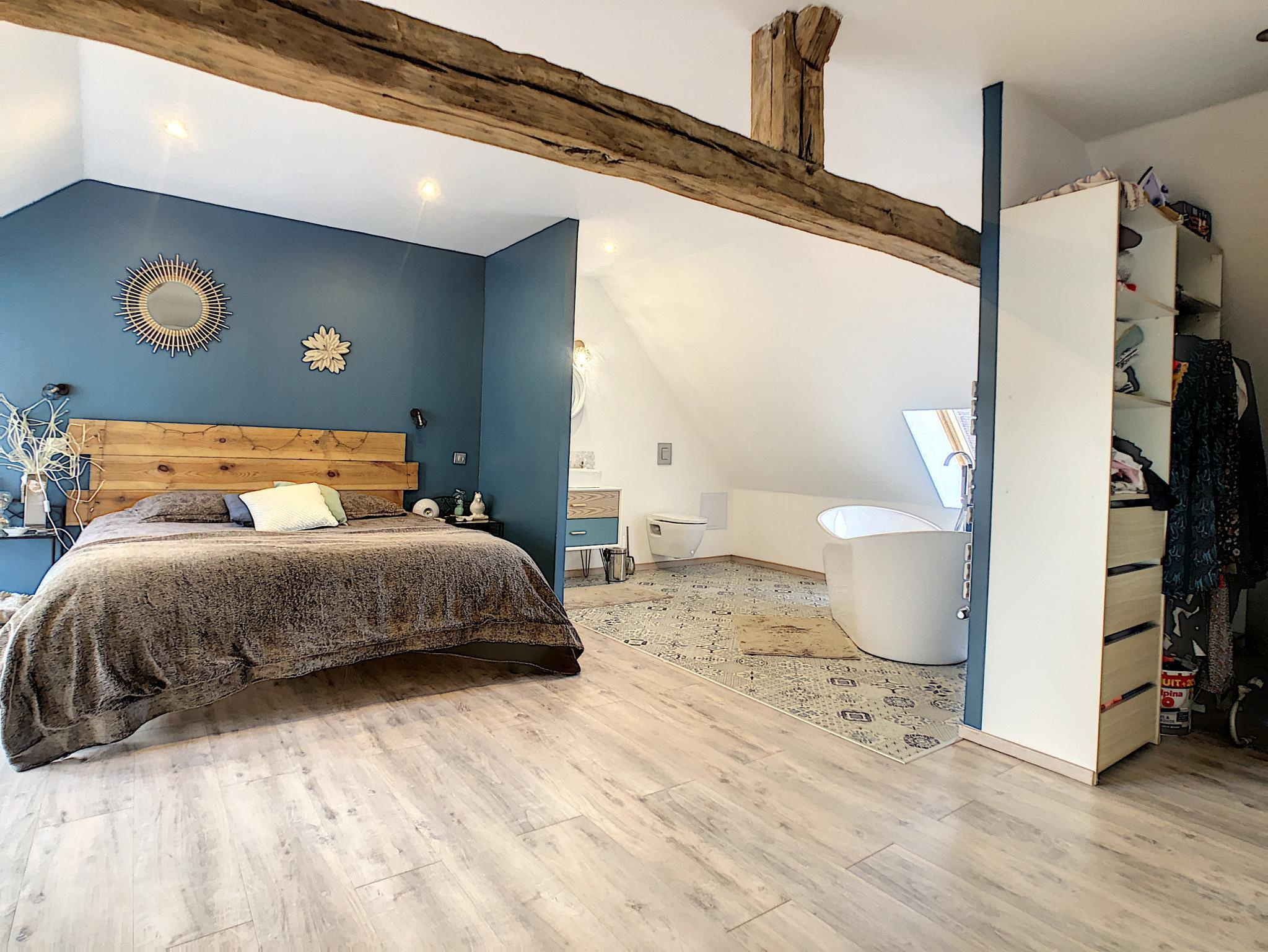Maison de ville rénovée comprenant entrée sur couloir, salon-séjour avec conduit de cheminée, cuisine aménagée équipée, bureau, toilettes, à l'étage: pièce dressing, deux chambres, salle d'eau avec toilettes, et second: suite parentale (chambre, salle de bains, toilettes, dressing) en annexe: cour, cave voutée, appentis, le tout sur une parcelle de 126 m² environ.