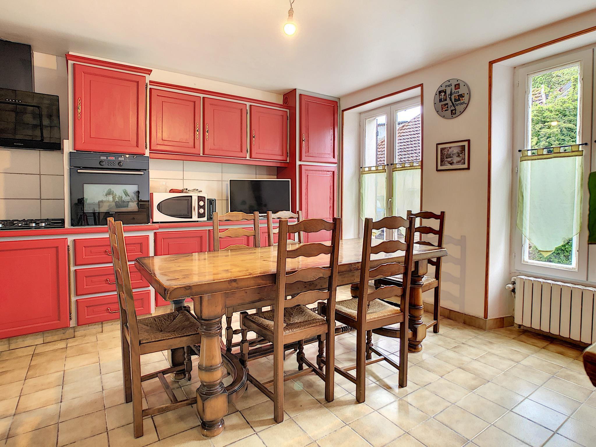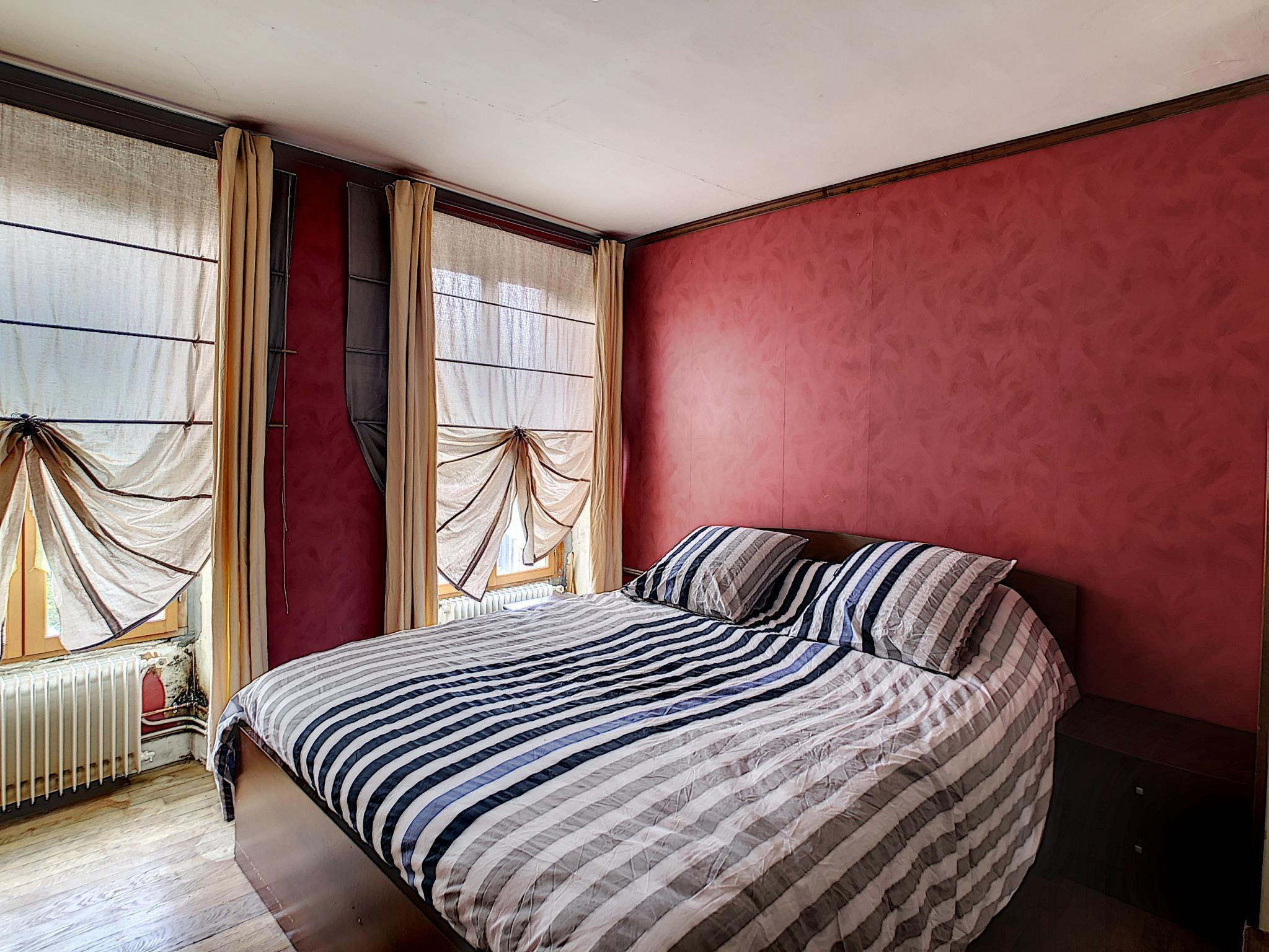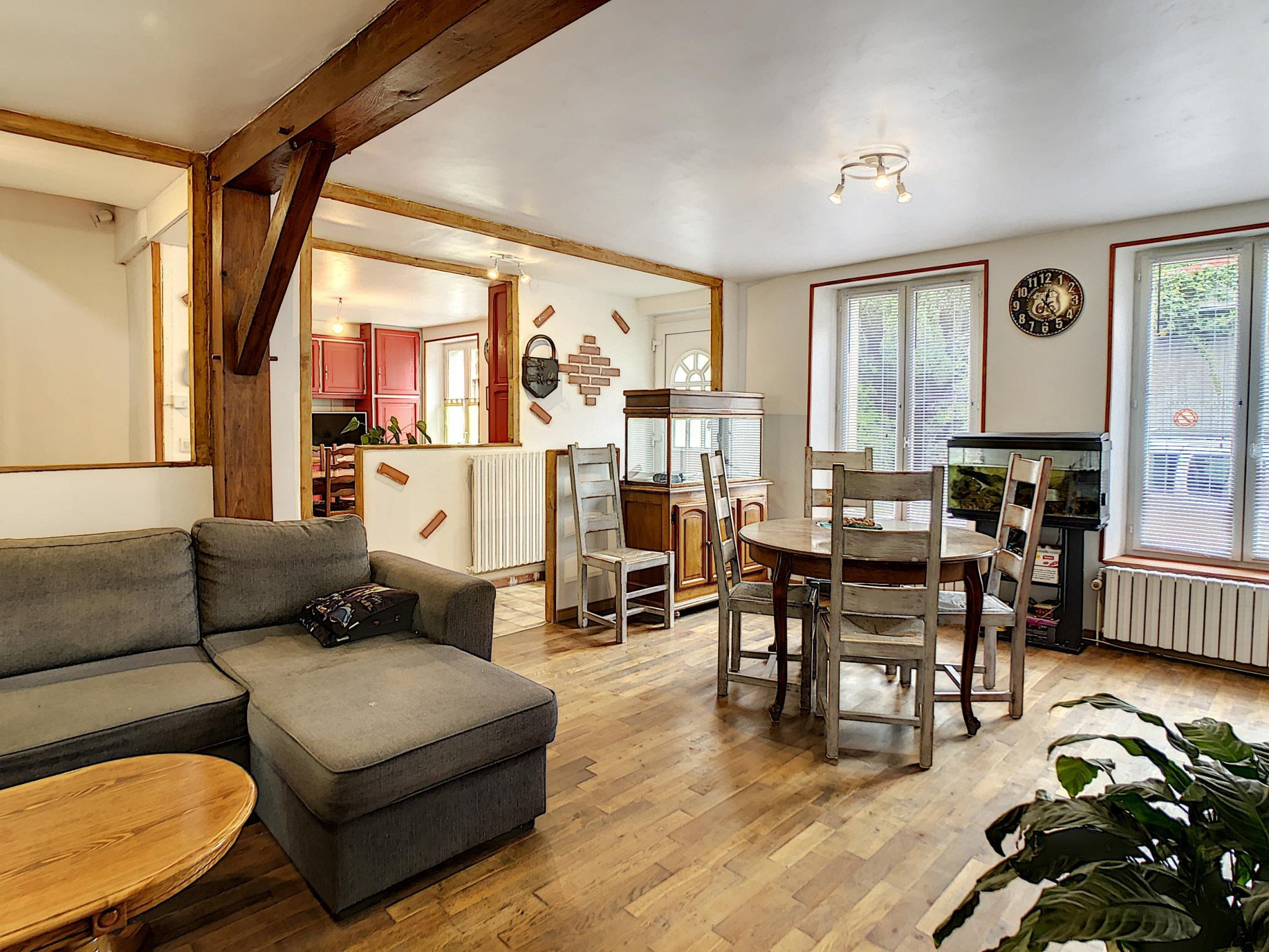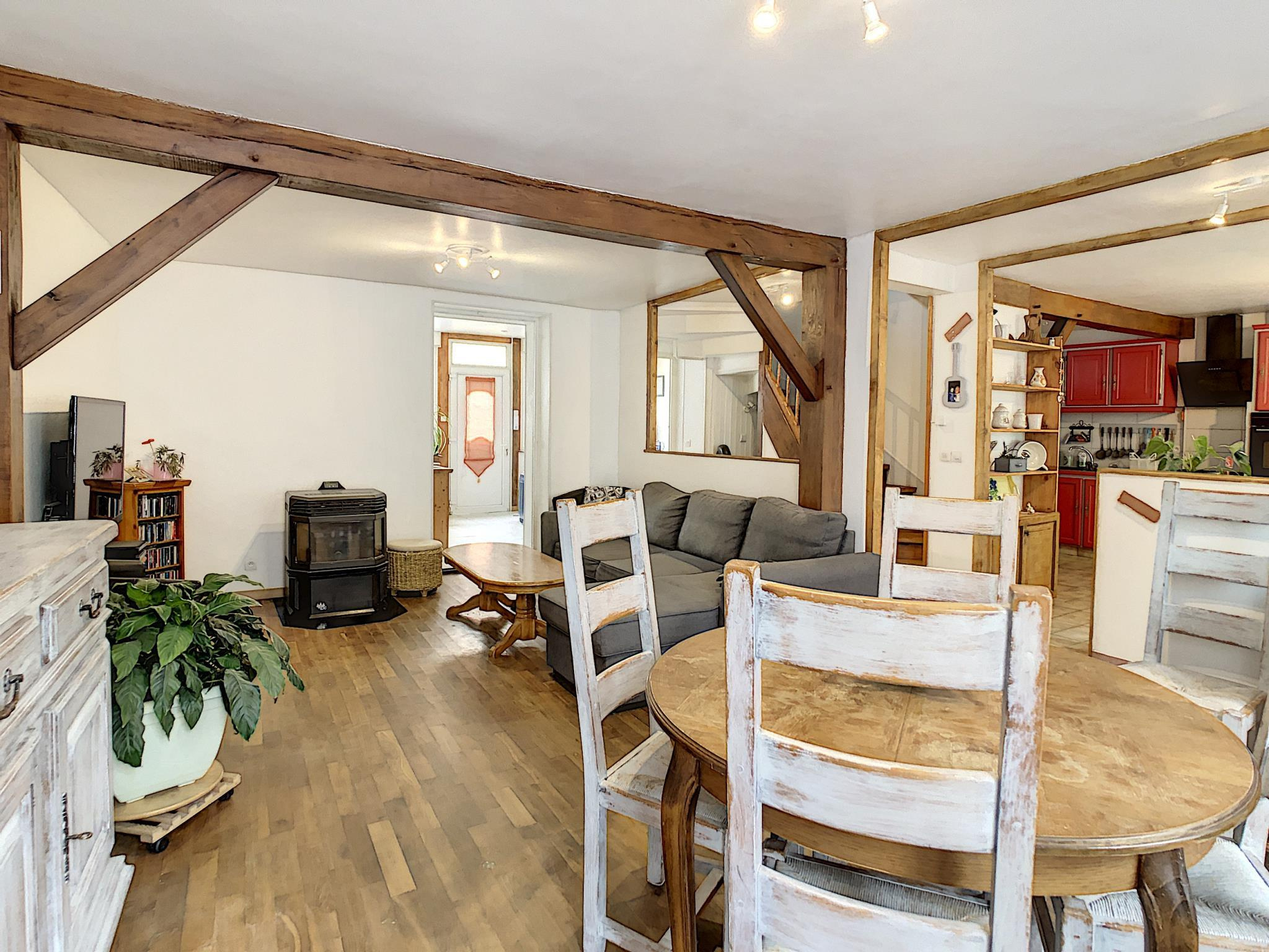 Maison de ville comprenant entrée, salon séjour avec poêle à granules, cuisine aménagée équipée, pièce de passage, salle d'eau, toilettes, à l'étage : palier desservant quatre chambres, salle de bains avec toilettes, grenier au-dessus, en annexe: cour sur l'arrière avec chalet, cave, le tout sur une parcelle de 193 m² environ.